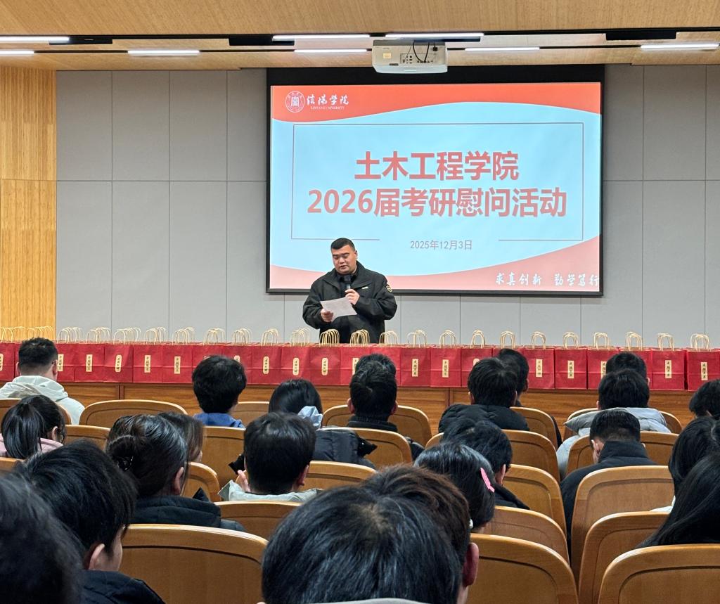 考研临近,为了给2026届考研备战学子加油鼓劲,缓解备考的紧张焦虑情绪,树立必胜的信心,12月3日下午,土木工程学院在浉河校区图书馆101报告厅举行了2026届考研学子慰问活动,学院名誉院长鲍鹏、党总支书记徐远东、教学副院长杨子泉、各秘书干事、毕业班辅导员及200余名2026届考研学子参加了本次活动。活动由党总支书记徐远东主持。