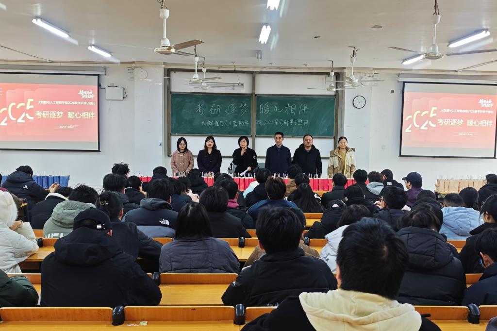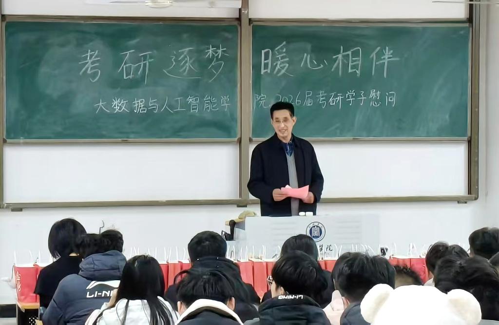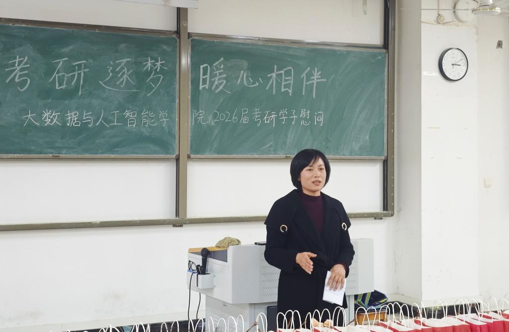 为助力2026届考研学子坚定信心、缓解备考压力,近日,大数据与人工智能学院于人文楼106教室开展“考研逐梦,暖心相伴”2026届考研学子慰问活动。学院院长邬长安、党总支书记高昌慧、学工干事鄢杰、全体毕业班辅导员以及2026届考研学生参加本次活动。活动通过暖心祝福、鼓励寄语与物资支持,为学子送上全方位关怀,现场氛围温馨而振奋。