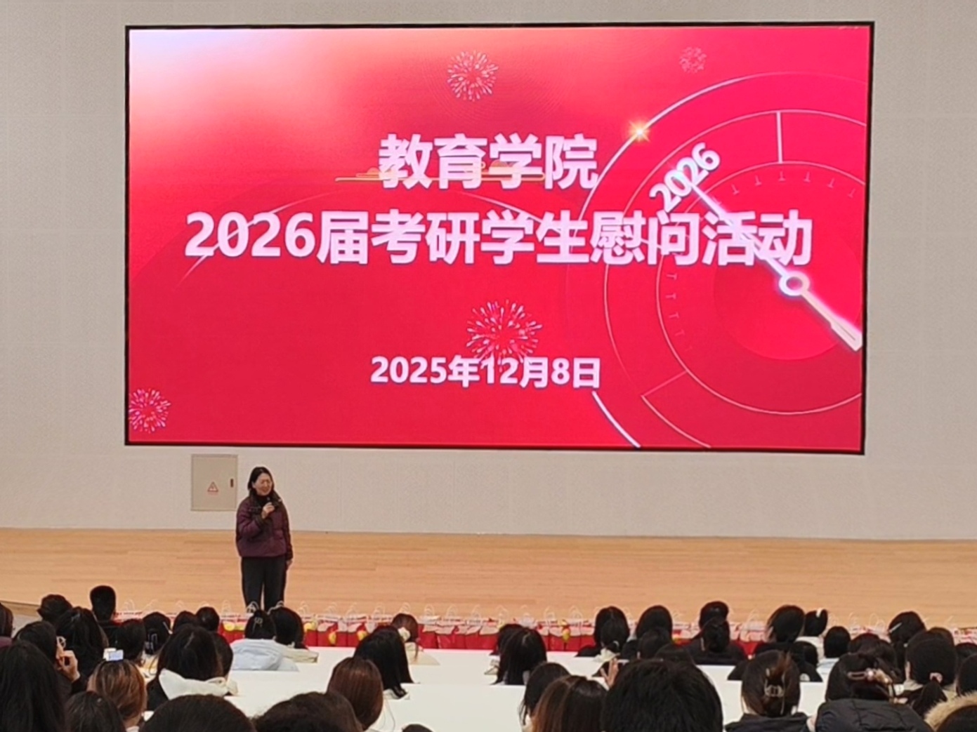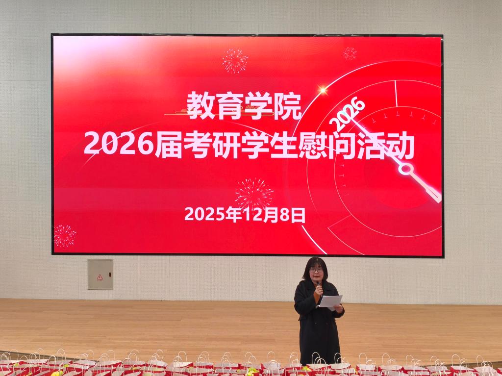 为助力2026届考研学生以饱满状态迎接冲刺阶段,12月8日下午,教育学院在教三楼104报告厅举行了考研学生慰问活动。名誉院长汪基德、党总支书记刘颖方、副院长段海丹及班子成员、各教研室主任、毕业班辅导员代表及2026届考研学生参加了此次活动,活动由刘颖方主持。