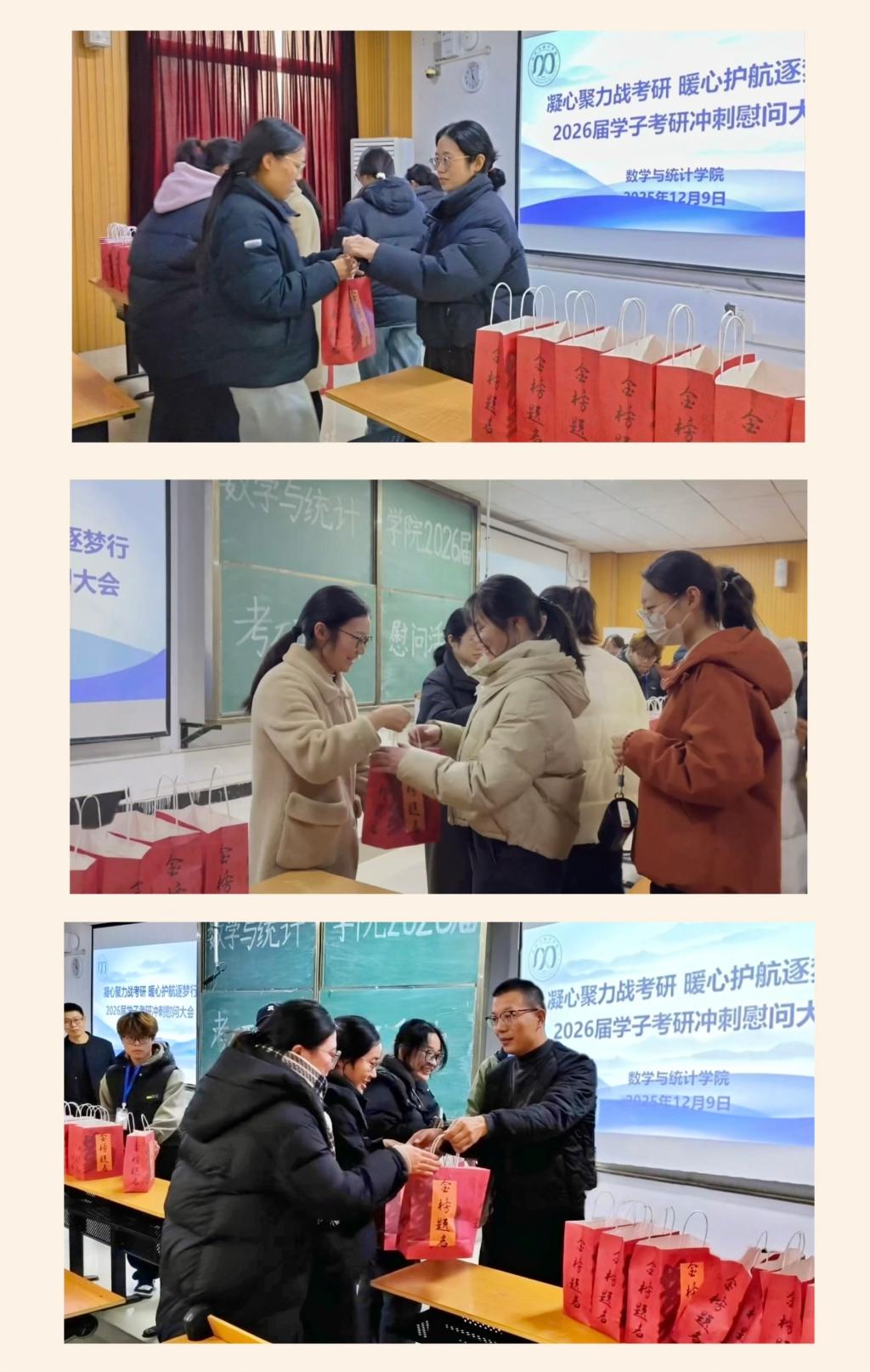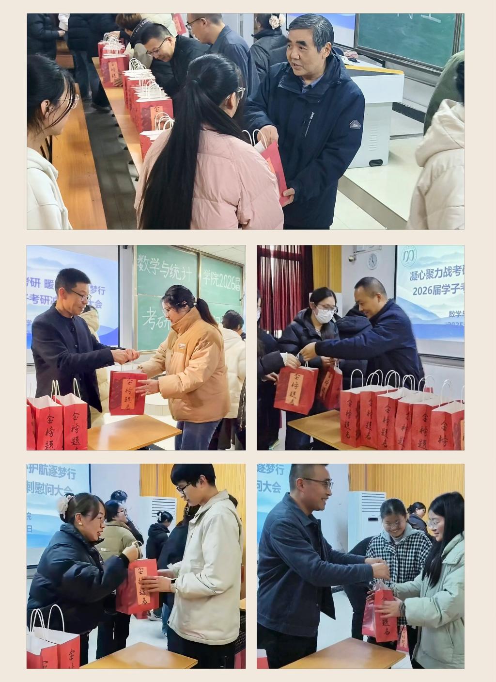 随后,学院领导与老师们亲手将精心筹备的“考研加油包”送到每一位学子手中。苹果、橙子分别象征着“苹”稳上岸,一战“橙”硕,爱心暖贴为寒冷冬日送上温暖,实用文具为考研复习助力,可乐、饼干、棒棒糖则为冲刺续航补充能量,每一件物品都饱含着学院的深切关怀与美好期许。学子们手持礼包,脸上洋溢着感动的笑容,现场掌声与欢呼声此起彼伏。