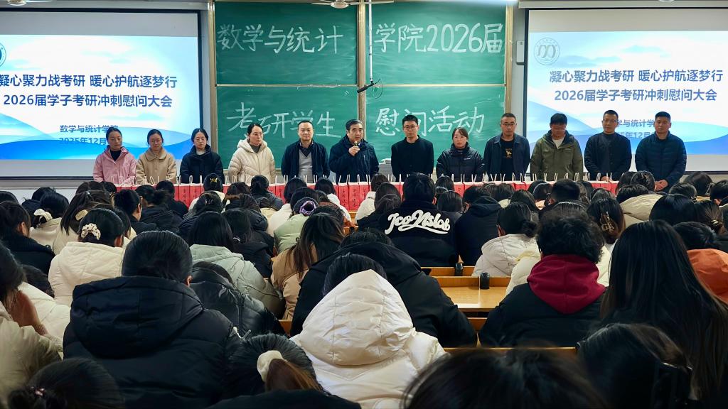 考研冲刺号角催,温情关怀暖人心。为帮助2026届考研学子缓解备考压力、坚定逐梦信念,12月9日下午,数学与统计学院在社科楼112教室举办考研冲刺慰问大会,数学与统计学院院长俞迎达、党总支书记郭二军、副院长张聪、学工干事田媛、行政干事闫珍珠、考研导师代表及全体毕业班辅导员齐聚一堂,与百余位考研学子面对面交流,用真挚关怀与务实举措为冲刺阶段的追梦人保驾护航。