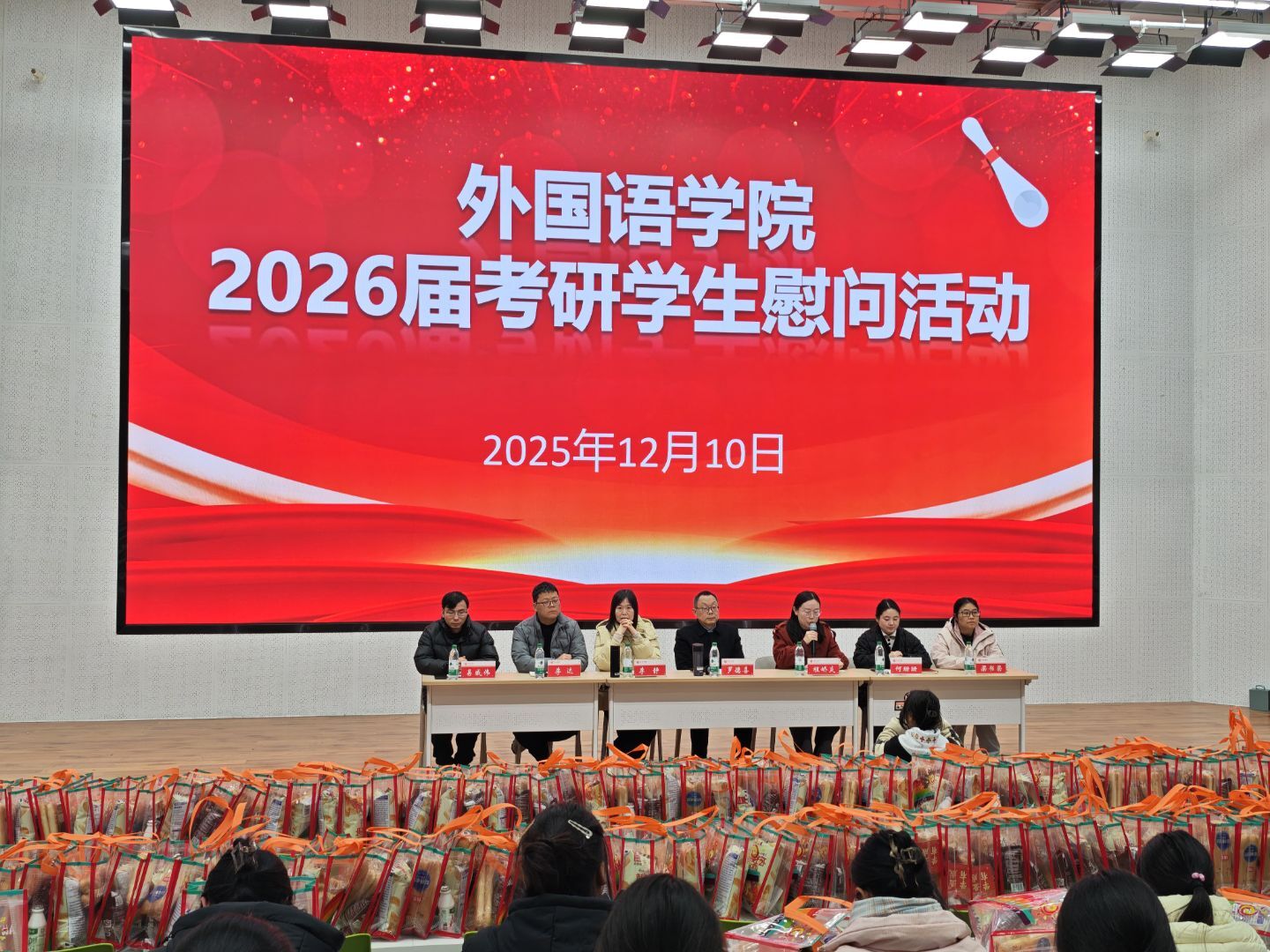 为给进入最后冲刺阶段的考研学子舒缓考前压力、提振迎考信心,外国语学院于12月10日下午,在南湖校区教二楼117报告厅举行“笃行不怠,研途花开”考研学子冬季慰问活动。外国语学院院长罗德喜、党总支书记程娇炎、副院长李静、教学干事李达、行政干事梁书荣、学工干事何珊珊及全体毕业班辅导员齐聚,为备考学子送去关怀与鼓励。此次活动由何珊珊主持。