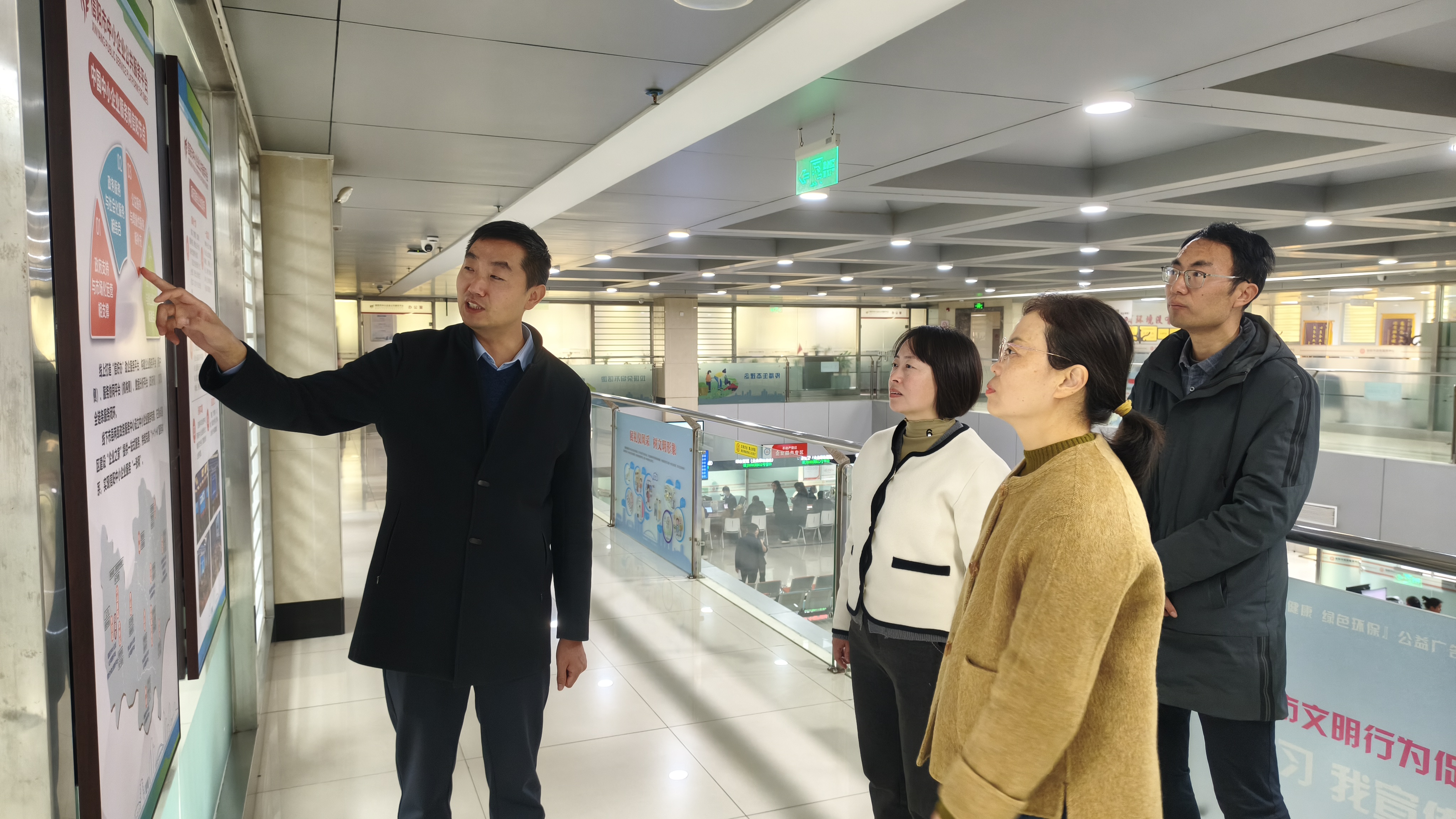 在企业负责人罗松的带领下,商学院一行先后参观了企业办公区、技术研发中心及客户服务大厅,实地感受企业的运营氛围与发展活力。罗松介绍道负责运营的信阳市中小企业公共服务平台是政府部门牵头,汇集各类优质服务机构和资源,为中小微企业及创业者提供政策、培训、招聘、投融资、技术创新等一站式、专业化服务的综合平台。详细介绍了企业的发展历程、核心业务布局、行业优势及在公共服务领域取得的显著成就,让商学院一行对企业的业务场景、人才需求导向有了直观且深入的了解。