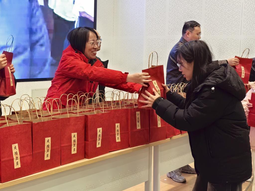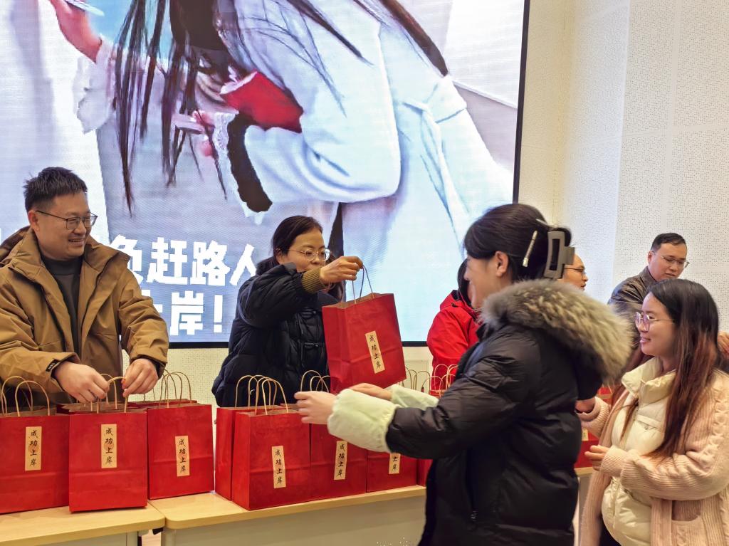 随后,学院领导班子为考研学生代表送上包含橙子(橙功上岸、心想事橙、一战橙硕、前橙似锦)、苹果(苹步青云)、牛奶(数你最牛)、面包(考试包过)等在内的“考研冲刺大礼包”,礼包中一张张手写祝福卡片,字里行间满是学院的牵挂与期许,让同学们在寒冬中感受到浓浓的暖意与力量。