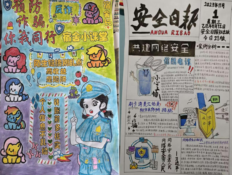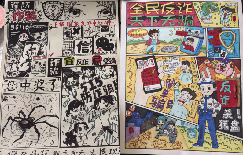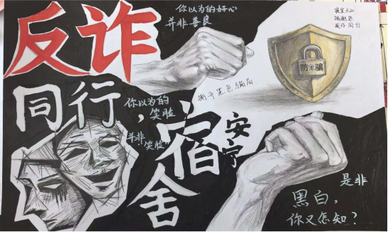 同学们围绕“反诈”核心主题,结合校园生活实际,聚焦电信网络诈骗、校园贷、刷单诈骗等常见诈骗类型,通过手绘等多种形式,将反诈知识与艺术创意深度融合。