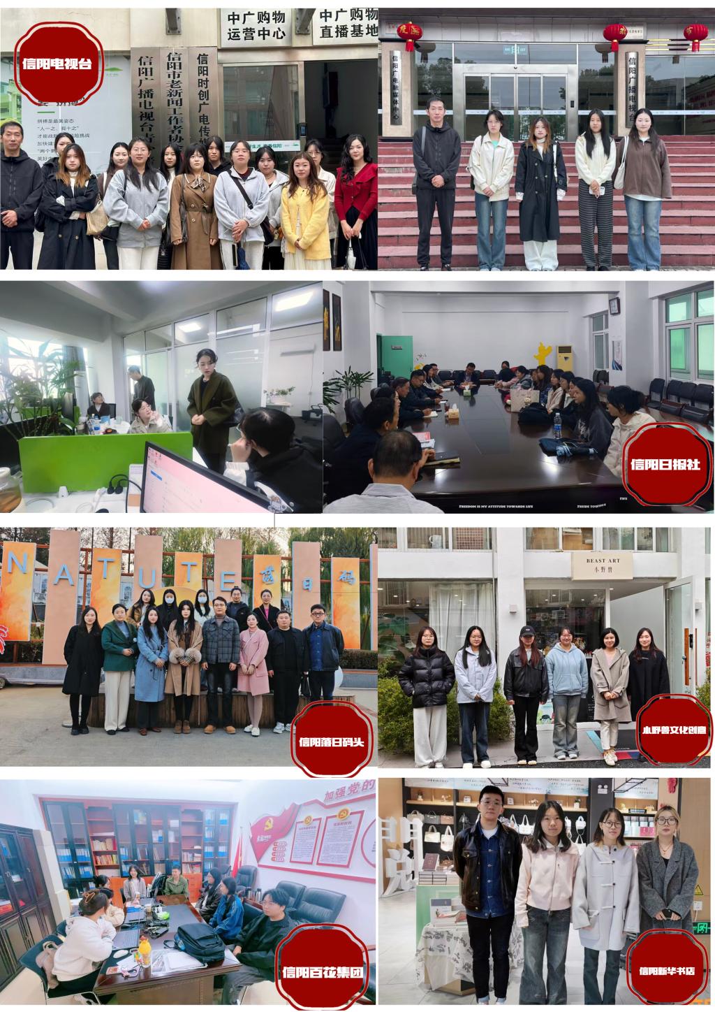 为深化产教融合,拓宽学生实习实践与就业渠道,视觉传达设计专业教师何伟、王歌、魏迁、娄濛、杨丽娜、郝倩倩一行,先后走访了信阳日报社、信阳电视台、信阳新华书店、信阳百花集团等多家本地重点企事业单位,通过实地考察、座谈交流等形式,与企事业单位深度对接,共探校企合作新路径。