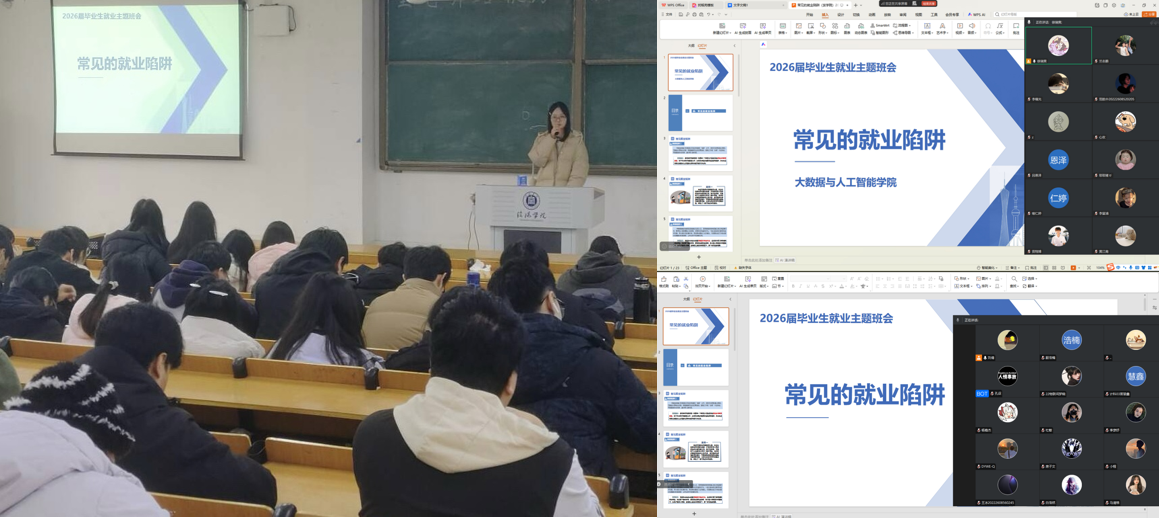 为帮助2026届毕业生增强就业安全意识、熟悉就业流程,12月24日至26日,大数据与人工智能学院组织全体毕业班辅导员召开就业主题班会。本次主题班会采用线下、线上两种形式,由毕业班辅导员杨韫幔、徐瑞爽、刘倩主持宣讲,全体2026届毕业生共同参与。辅导员围绕就业陷阱防范、就业政策解读、就业信息上报及离校安全等内容展开讲解与交流。