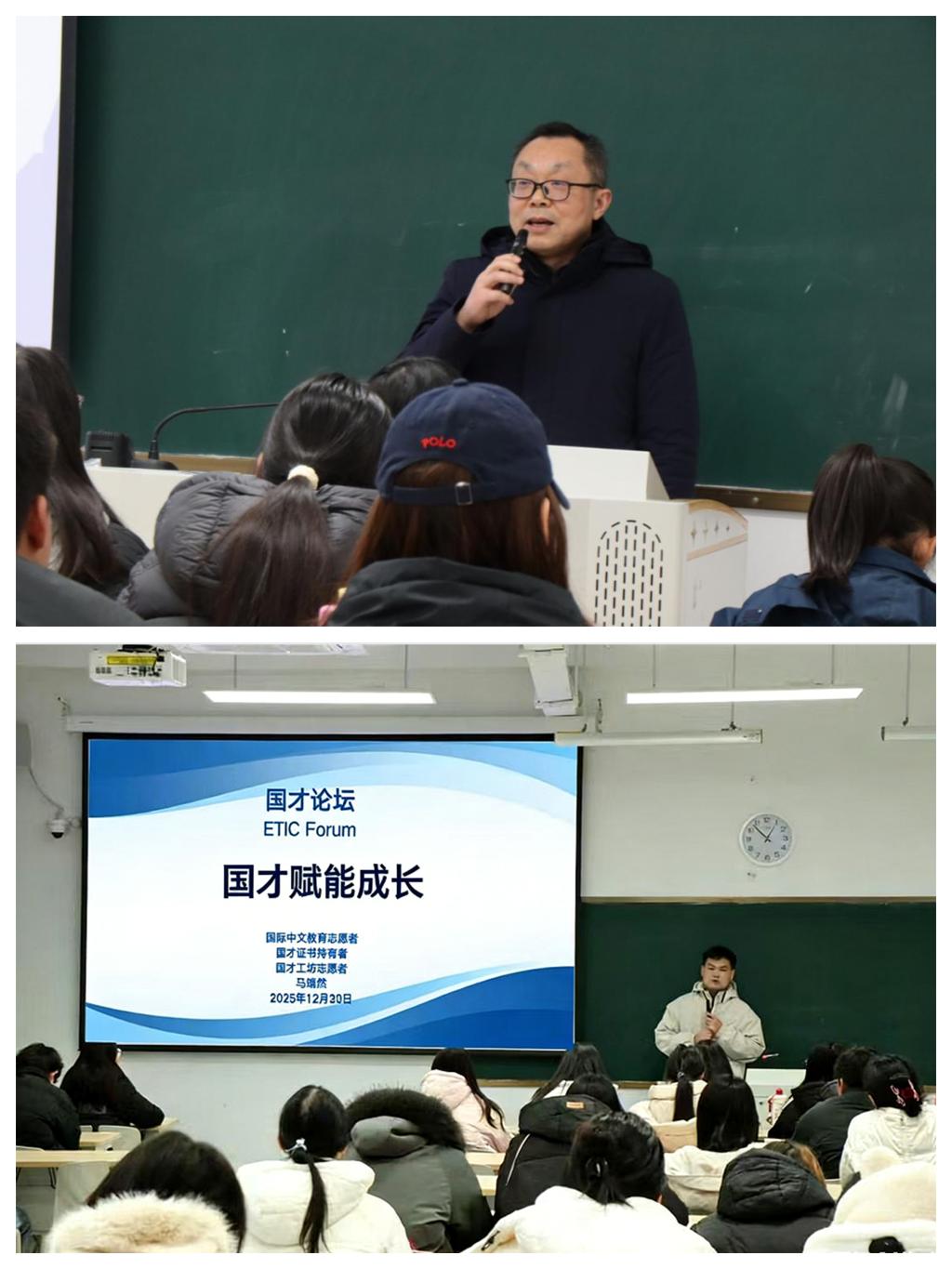 12月30日,外国语学院2025届校友、教育部语合中心国际中文教育志愿者马靖然,重返母校,为在校学子带来一场主题为“国才赋能成长”的专题讲座。外国语学院院长罗德喜、国才工坊指导教师董文静、辅导员王萌及百余名师生一起聆听讲座。讲座由董文静主持。