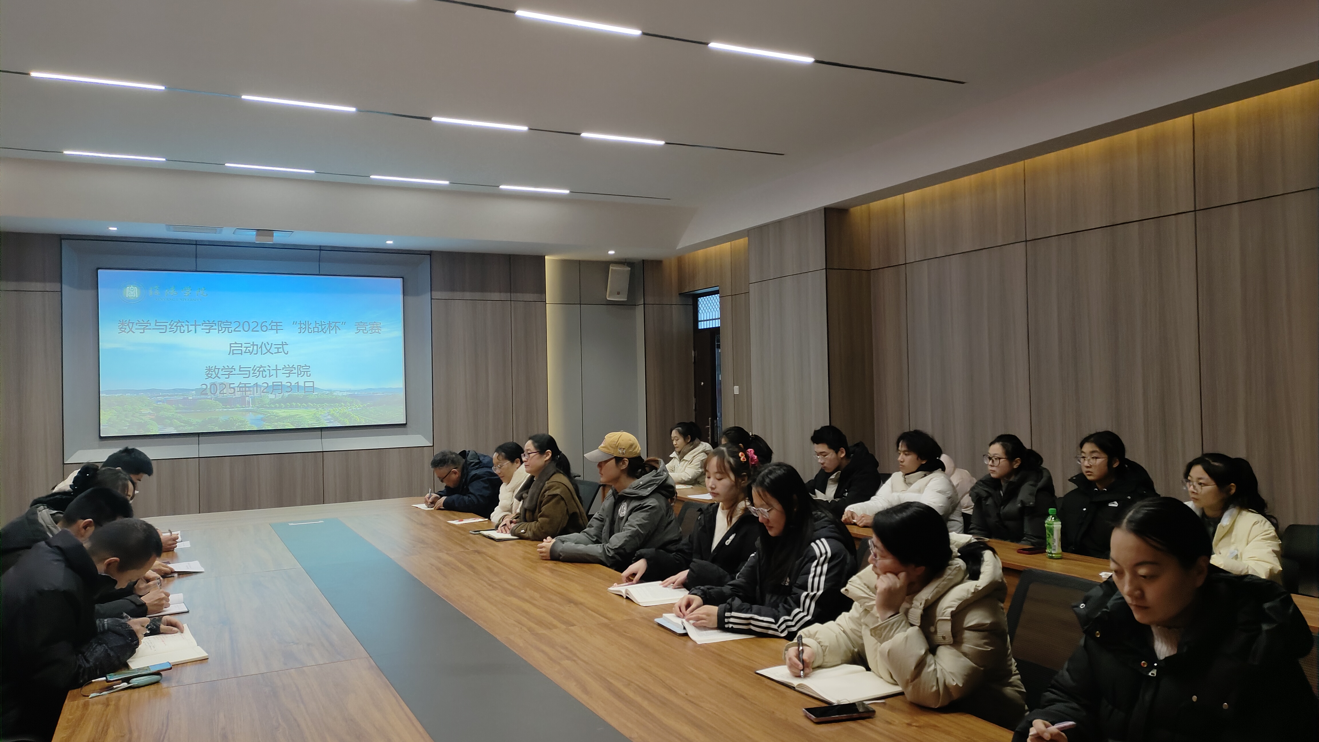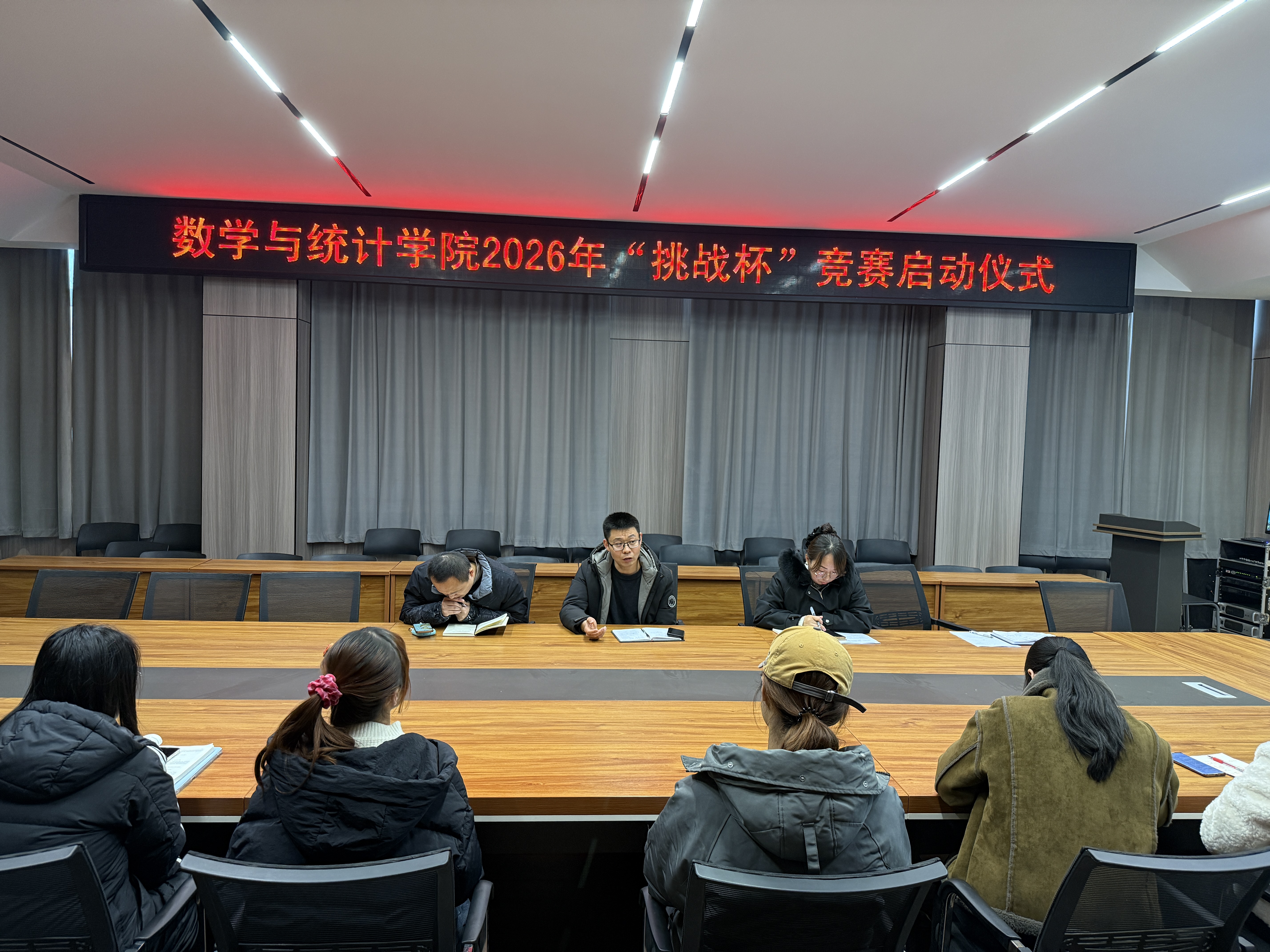为积极备战2026年“挑战杯”大学生创业计划竞赛,激发师生创新活力,12月31日,数学与统计学院在社科楼109会议室召开2026年“挑战杯”竞赛启动仪式。学院党总支书记郭二军、副院长张聪、学工干事田媛、各教研室主任、教师代表、全体辅导员及13支学生团队负责人参加了会议。会议由胡涛主持。