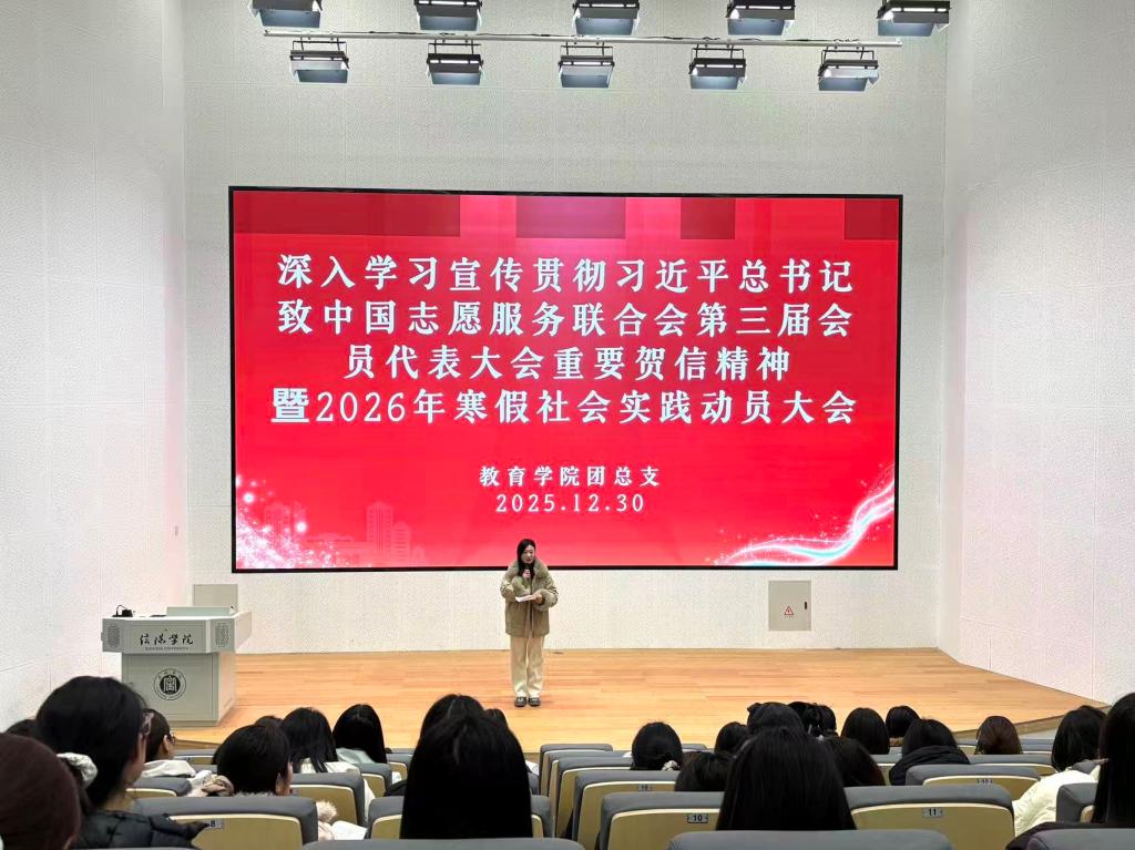 为深入学习宣传贯彻习近平总书记致中国志愿服务联合会第三届会员代表大会重要贺信精神,扎实推进2026年大学生寒假社会实践工作,教育学院于12月30日在南湖校区教三楼005报告厅召开深入学习宣传贯彻习近平总书记致中国志愿服务联合会第三届会员代表大会重要贺信精神暨2026年寒假大学生社会实践动员大会。党总支书记刘颖方,学工干事胡超,团总支书记姜红,各班团支书、团员代表和党员代表参与本次会议。