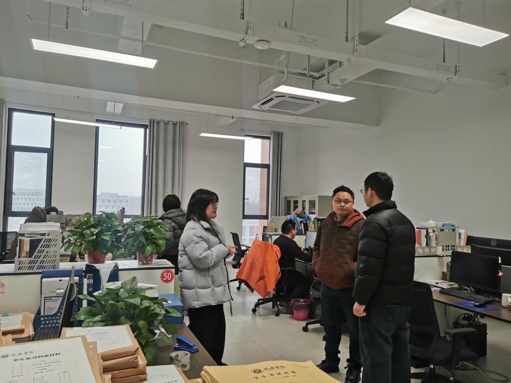 在教研室的走访过程中,学院领导班子与各教研室负责人进行了深入交流,详细了解了教师们的备课情况以及新学期的教学计划安排。他们强调,教学工作是学院的核心任务,必须确保每一门课程都能够高质量地开展。同时,还鼓励教师积极探索创新教学方法,结合学生实际需求,优化课堂内容,以提升教学效果和学生的学习体验。此外,刘书记和段院长还特别关注教研室的日常管理情况,包括教学资料的整理归档、办公环境的整洁程度等,确保为老师们营造一个高效且舒适的工作氛围。