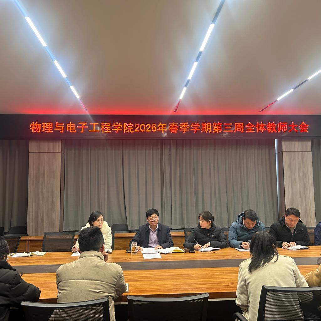 为科学部署2026年学院重点工作,凝聚全院教师育人合力,3月17日下午,物理与电子工程学院在社科楼109会议室召开全体教师大会。学院全体教师参加会议,会议由党总支负责人赵佳主持。