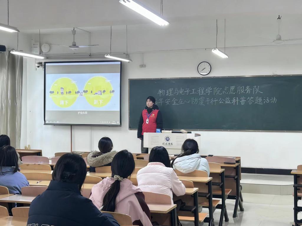 三月春风送暖,雷锋精神传扬。为弘扬“奉献、友爱、互助、进步”的志愿精神,扎实普及防震减灾安全知识,切实提升师生应急避险与自救互救能力,物理与电子工程学院志愿服务队于3月16日在理工楼506开展“安全在心,防震于行”公益科普答题活动,以实际行动践行学雷锋志愿服务精神。