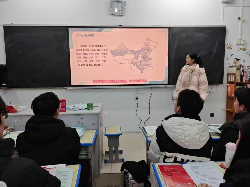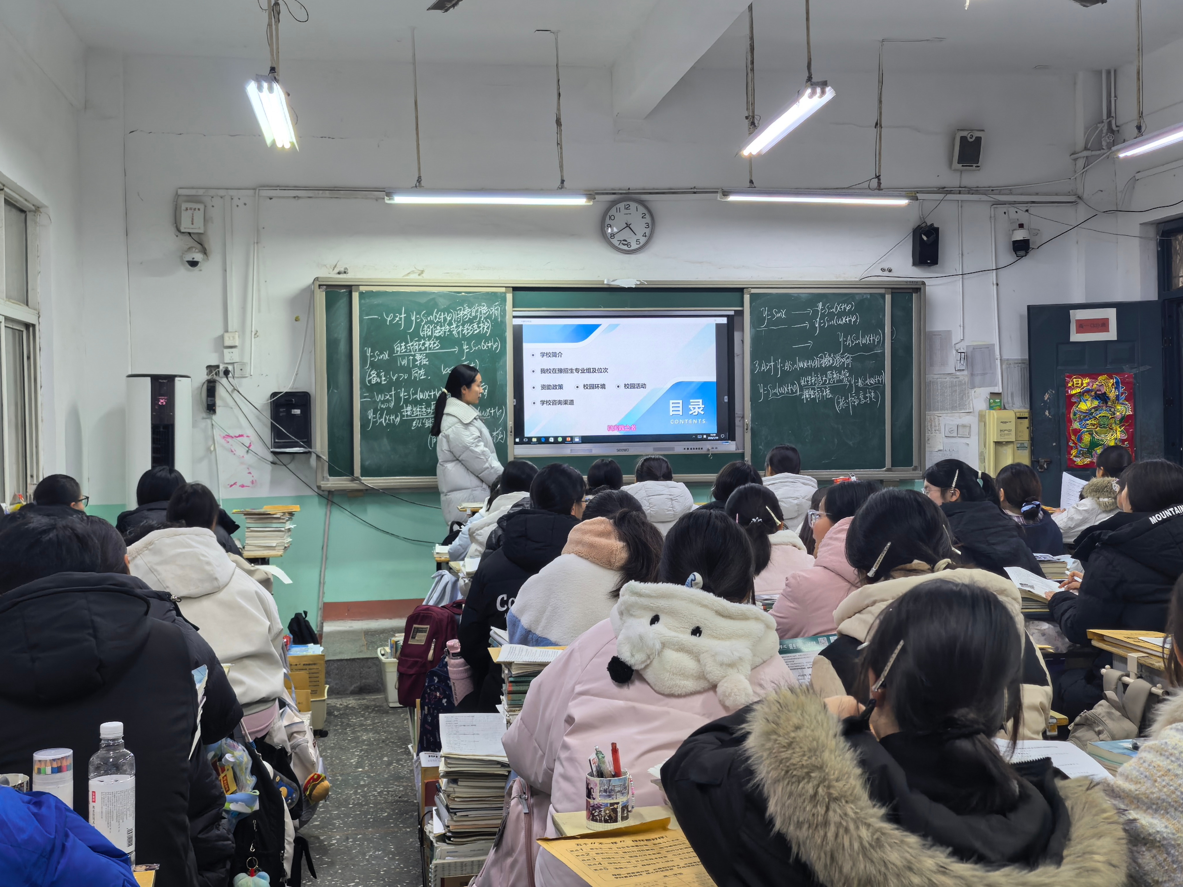 邢雨欣同学重返母校,以“过来人”的视角开展招生宣讲。她通过发放宣传资料、展示PPT和播放校园宣传片等形式,系统介绍学校办学特色、专业优势及校园生活,并耐心解答高三学生关切的问题,送上真挚祝福。宣讲在温暖交流中深化情感联结,也让她在实践中实现自我成长。