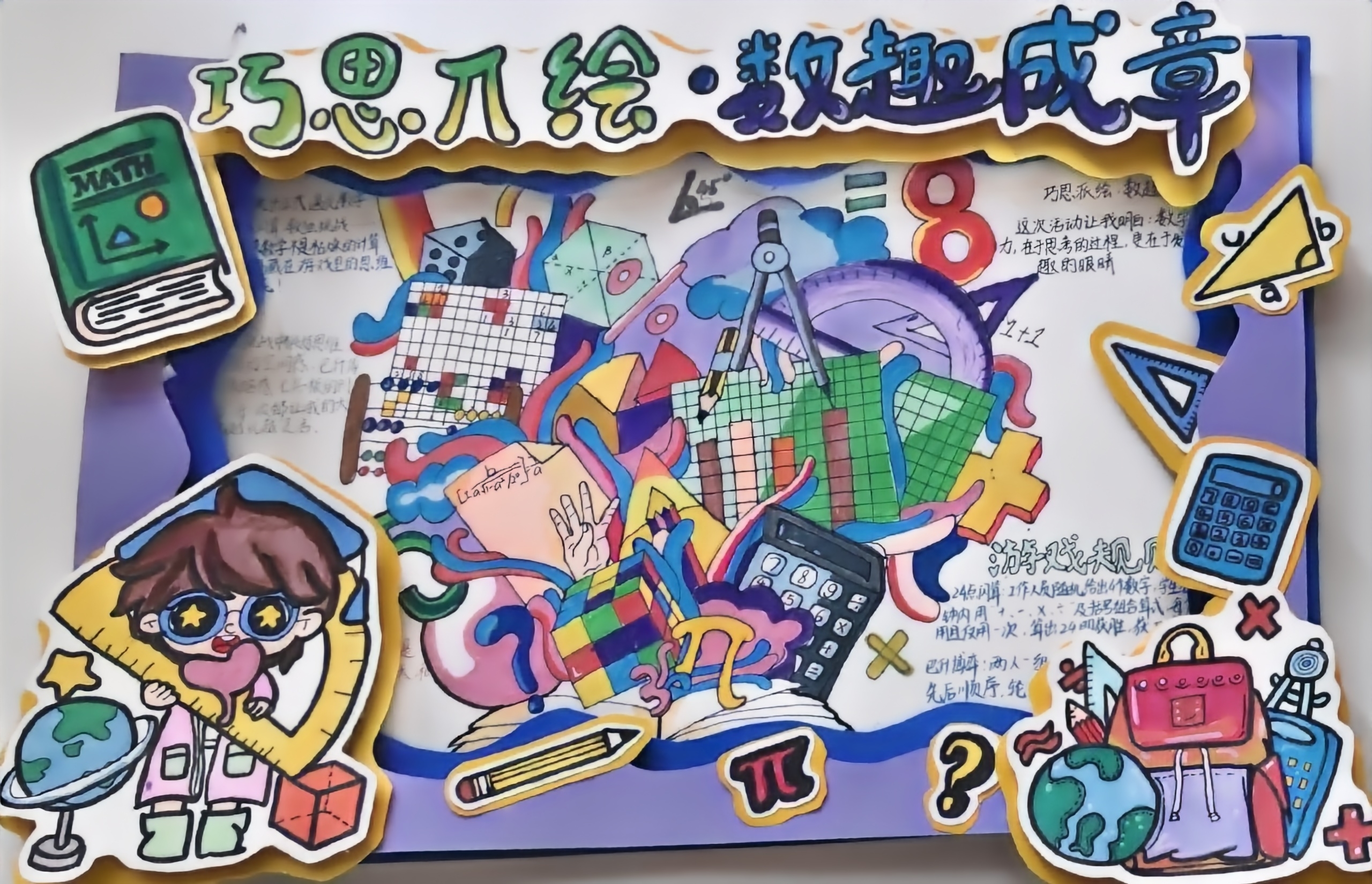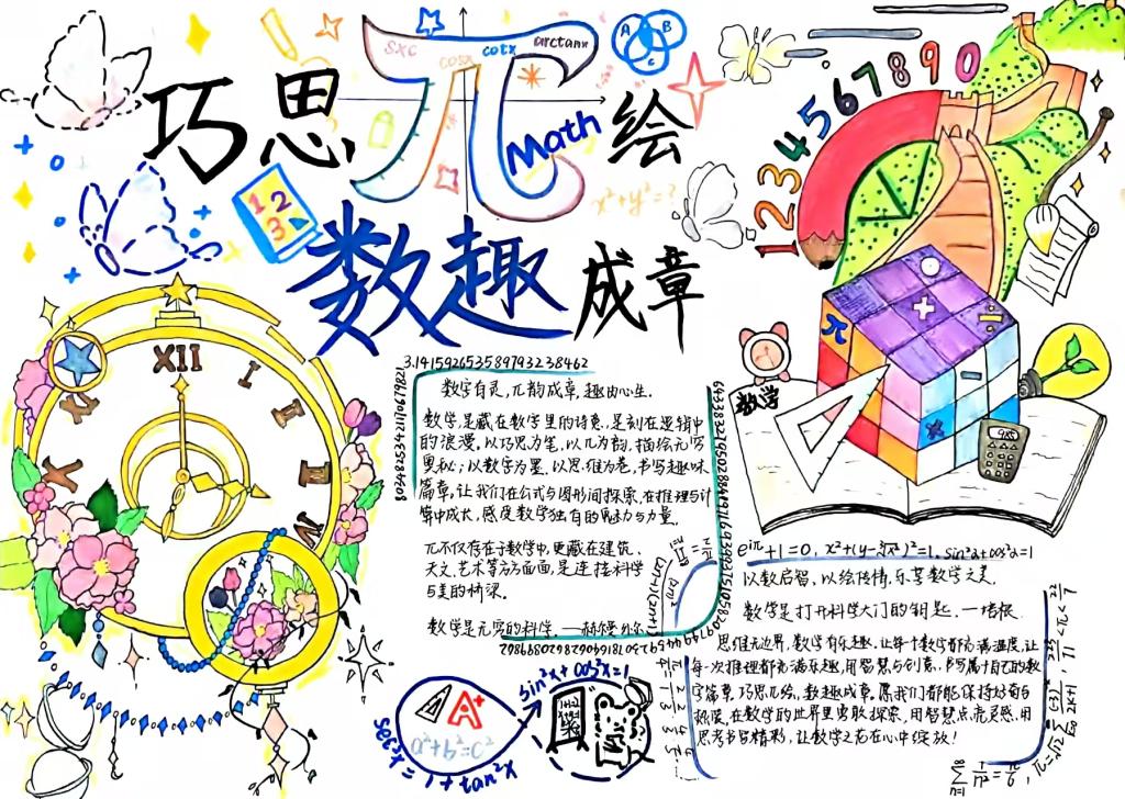 同学们围绕数学知识点、定理、公式或数学思想展开创作,作品主题明确、内容科学准确,形式涵盖手抄报与画报两类。大家以笔为媒、以画为介,将抽象的数学知识转化为生动直观的视觉语言,既有严谨的公式推导与定理解析,也有充满创意的数学故事与趣味插画,充分展现了数学与艺术的交融之美。参赛作品版面整洁、设计美观、图文并茂,在严谨的科学表达中融入了丰富的创意与艺术性,体现了同学们对数学文化的深刻理解与独特感悟。