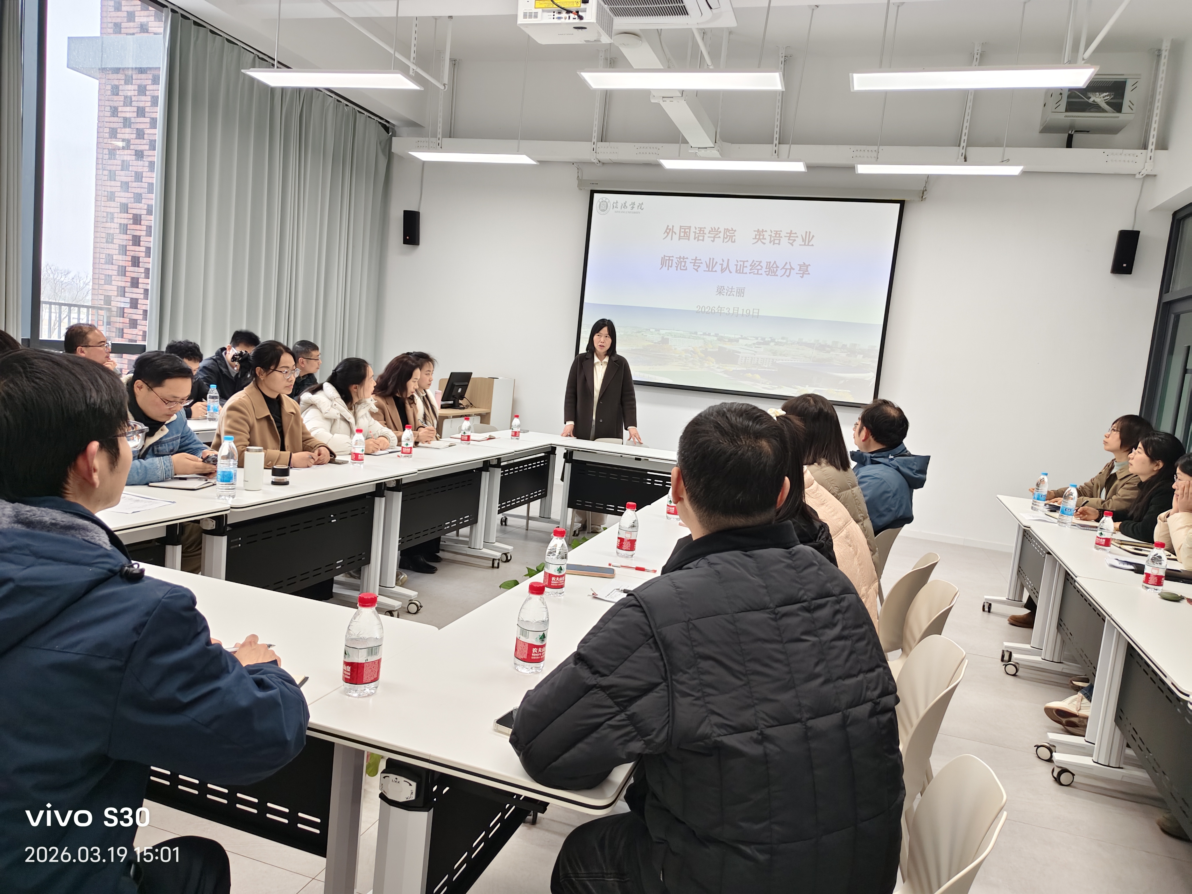 参会的各专业领导与老师认真聆听、细致记录,围绕认证指标落实、材料筹备、跨专业协同等内容展开交流探讨,相互借鉴筹备经验,凝聚工作共识。分享会结束后,全体参会人员共同前往外国语学院523查看英语专业师范认证相关支撑材料,梳理现有材料短板,明确后续完善细节,进一步夯实了认证筹备工作基础。李静院长和梁法丽老师现场耐心解答老师们的疑问。