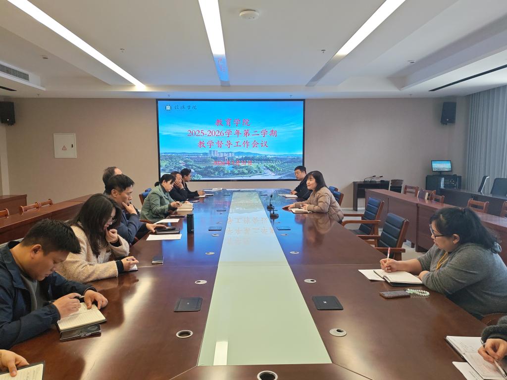 为加强教学质量监督与保障,准确落实学期初学校教学督导工作会议提出的关于督导听课的新要求,3月31日下午,教育学院组织全体二级督导人员在521会议室召开了2025—2026学年第二学期教学督导工作会议。教学副院长段海丹主持会议,校督导刘丽红、王可两位教授参加了会议。