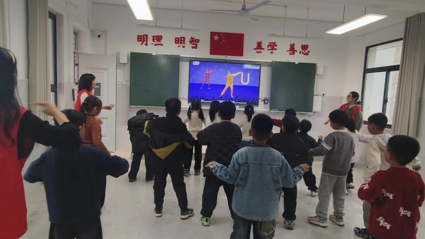 在热场环节之后,志愿队大学生们以游戏与歌曲为导入,展开“Greeting”主题教学。小学生们踊跃参与,积极互动。志愿队选取《Hello Song》《I'm Good》及字母操等英文儿歌,组织问候语与字母的趣味操练,将学习内容与趣味活动有机结合,为小学生们带来生动难忘的学习体验。