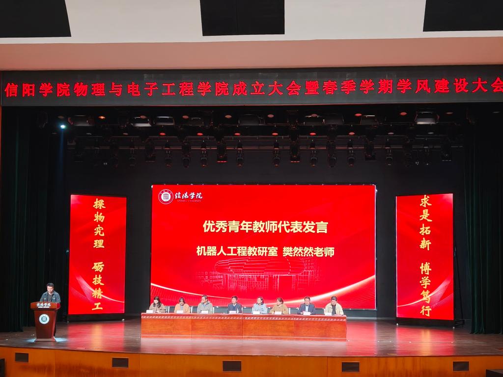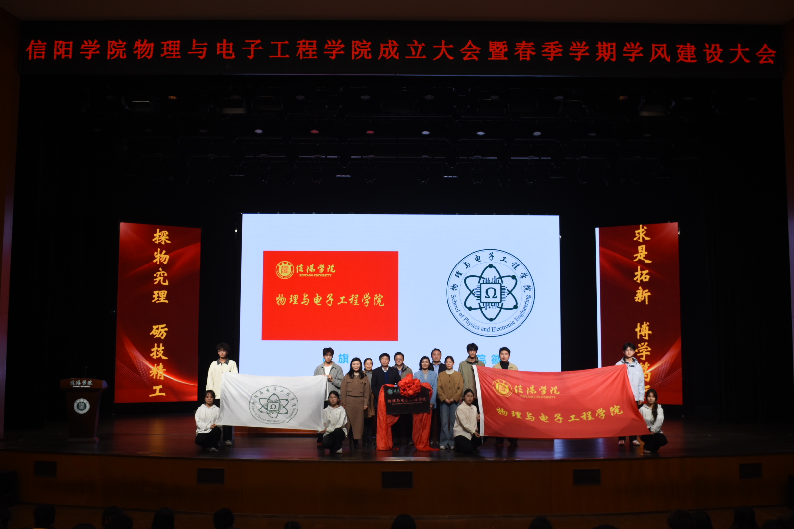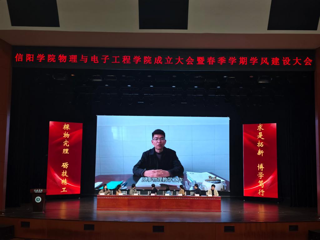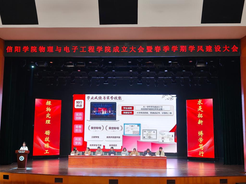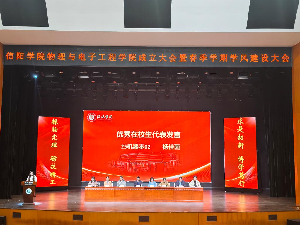 春和景明,万物向荣。3月31日19点,物理与电子工程学院成立大会暨2026年春季学期学风建设大会在浉河校区音乐厅隆重举行。院长李根全、党总支负责人赵佳、教学副院长董玉静及全院师生齐聚一堂,共同见证学院成立的重要时刻。大会由学工干事姜红主持。