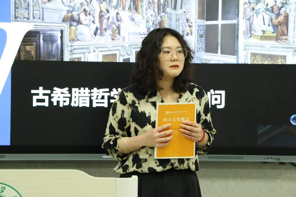 于日常琐碎里品人间烟火,在思想星河中探智慧本源。许文雅老师围绕《当代文学(二)》第四章,对新写实小说展开深度剖析,带领同学们解读《一地鸡毛》里的世间百态。课堂上,她巧妙结合情景教学法与AI辅助教学,借助AI生成专属场景化视频图画,将小说中的经典情境直观呈现在学生眼前;又顺着文本脉络,逐段解析主人公的细腻心绪,引导大家一同品味当代生活的本真面貌与复杂况味,评委评价这是一次扎实有效的教学创新;秉持爱智求真的初心,万玲玲老师以《西方文化概论》为载体,带来了一堂思辨浓度拉满的古希腊哲学专题课。课程开篇,万老师就以“AI眼中的世界本原是什么”抛出问题,顺着问题溯源而上,带领学生一同踏入古希腊哲学的智慧星空。她将智能工具自然融入课堂,同时明确提醒学生:AI可以作为思考助手,却永远不能替代独立思考,既创新了课堂形式,又守住了教学的核心本质。