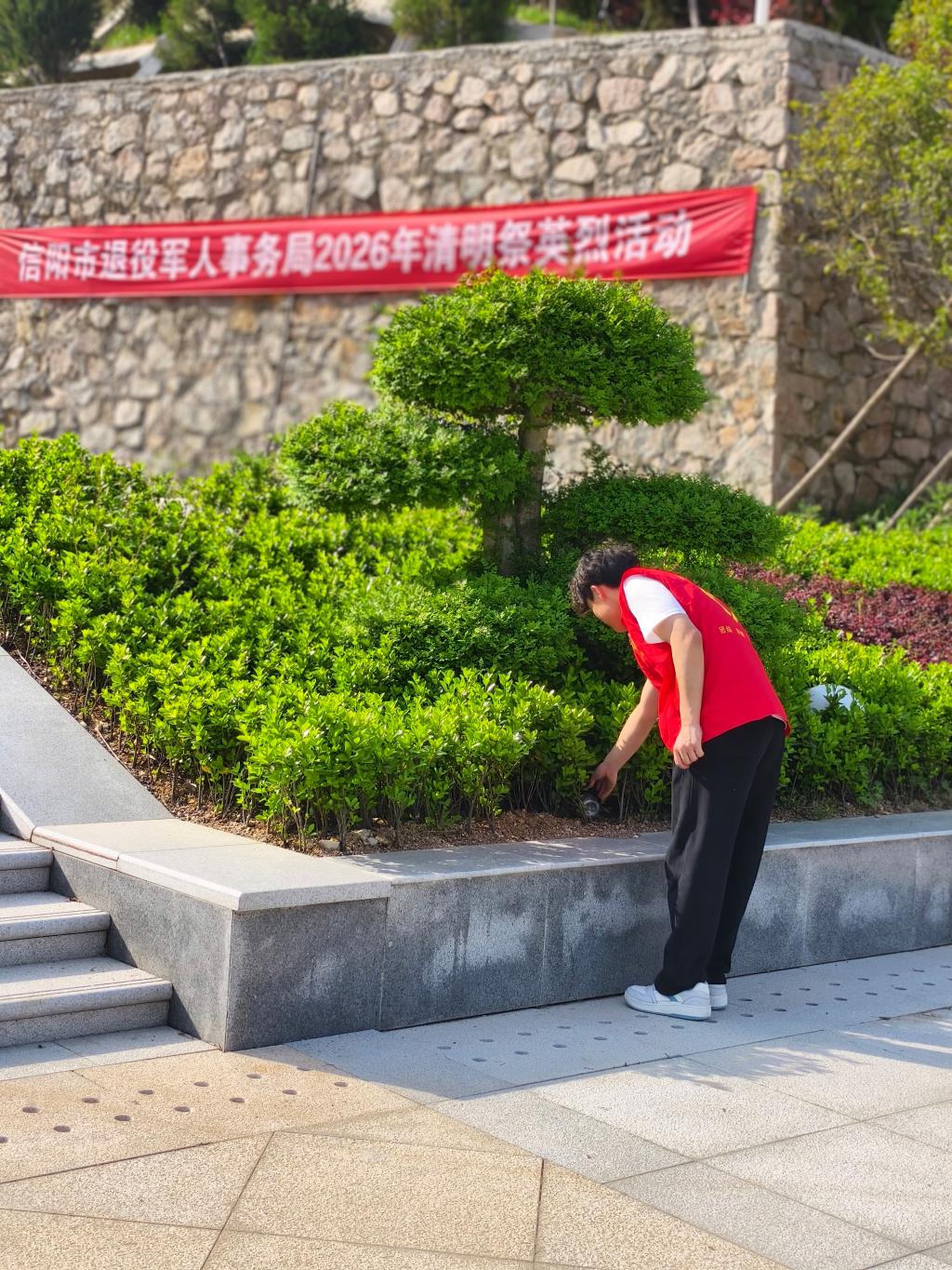 为了以实际行动表达对英烈的敬仰和对陵园环境的爱护,团总支组织同学们开展了园区卫生打扫志愿服务。志愿者们身穿红马甲,分组对陵园纪念广场、绿化带及烈士墓区周边进行了细致的清扫。