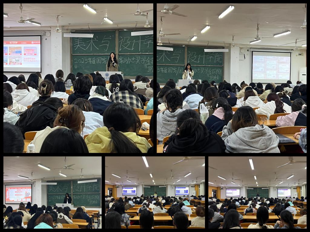 4月8日,美术与设计学院成功举办了2025年度国家奖学金、国家励志奖学金颁奖典礼暨优秀学子进班级宣讲活动。学院党总支书记郑山峰、副书记秦金峰、团总支书记李静、全体辅导员及各年级学生代表参加活动。