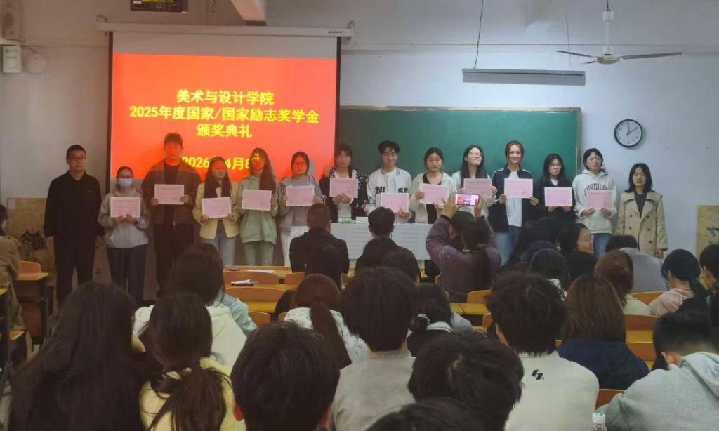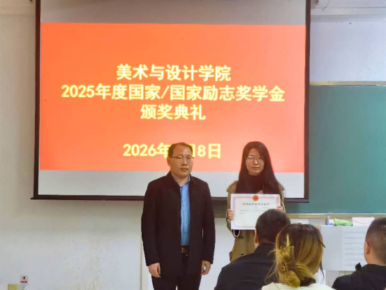 颁奖典礼上,秦金峰宣读了《美术与设计学院2025年度国家奖学金、国家励志奖学金获奖名单》。学院领导老师向国家奖学金和国家励志奖学金获得者颁发获奖证书。