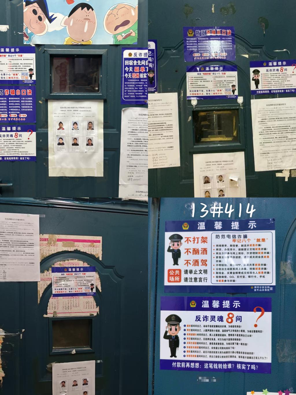 宿舍作为学生生活的主要场所,是安全教育的重要阵地。学院统一张贴了内容简洁、警示性强、贴合青年审美的防诈宣传页,重点梳理常见诈骗手法、反诈专线96110、国家反诈中心APP下载提示及校园报警方式。宣传页统一张贴于宿舍门后、书桌旁、公告栏等学生停留与视线聚焦区域,确保“抬眼可见、驻足即观”。通过高频次、近距离的视觉提醒,将反诈知识深植学生日常生活,形成“寝室小课堂”与“班级微课堂”协同发力的教育闭环。