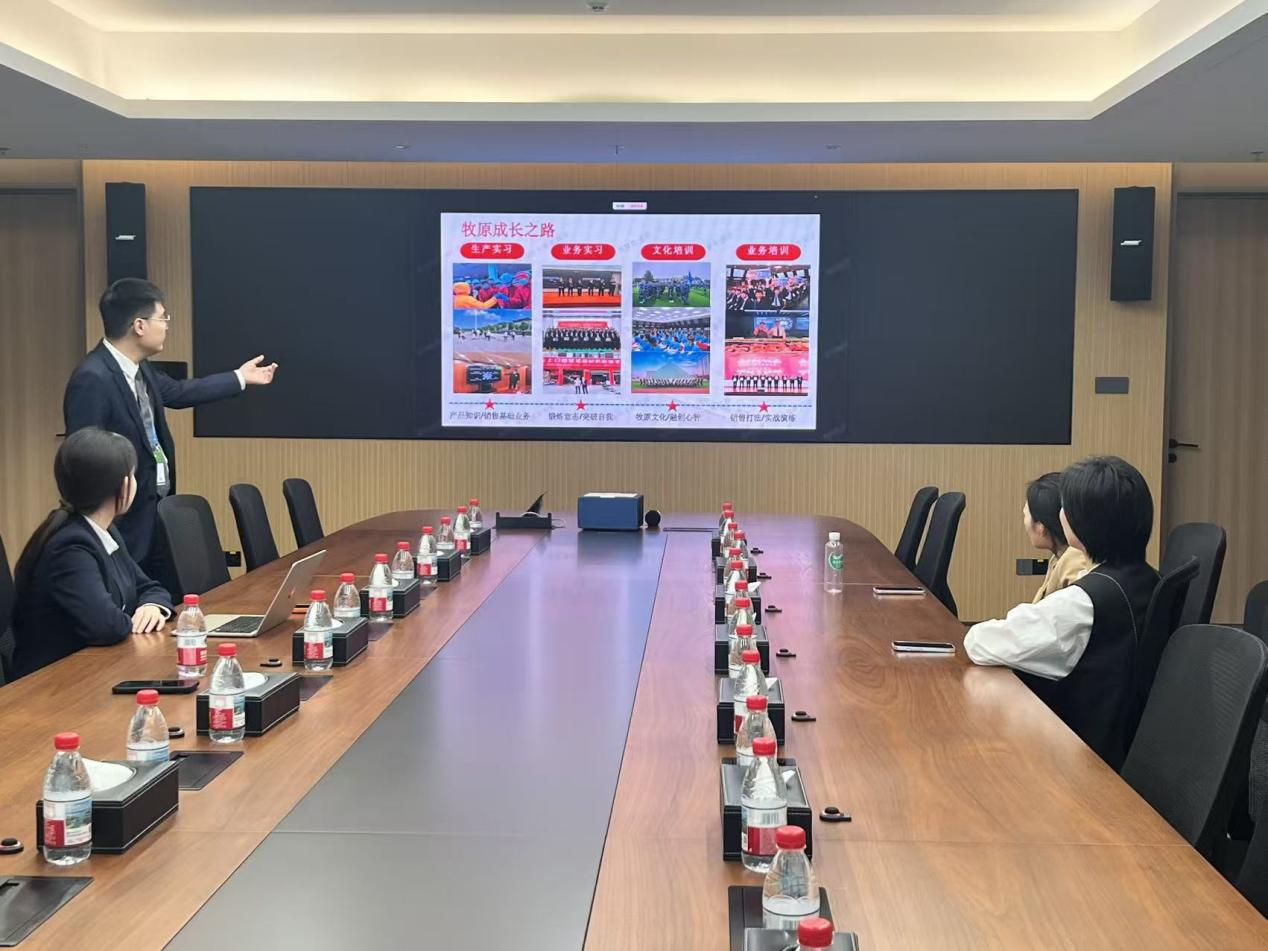 随后,学院一行前往郑州牧原开展访企拓岗工作,接待人员首先带领学院一行参观了牧原集团展厅,通过图文展示、实物陈列、多媒体演示等多种形式,详细介绍了牧原集团的发展历程、核心理念、技术优势及用人观念,全面展现了企业的发展底蕴、行业影响力与未来发展规划,让学院一行对牧原集团有了更为系统、全面的认识。