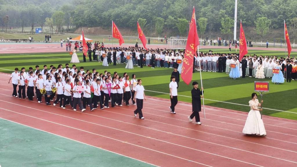 伴随着激昂的入场旋律,学院方阵登场。队伍前方,旗帜迎风猎猎,尽显学院气势;后方方阵中,同学们手持数学元素道具,将学科特色巧妙融入入场式,创意十足。