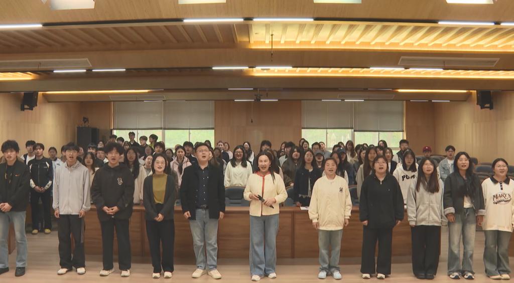 授课尾声,在李鸣凤的带领下,全场学生共同合唱红色经典民歌《八月桂花遍地开》。这首诞生于商城、传唱大江南北的经典曲目,以悠扬的旋律、真挚的情感,将现场氛围推向高潮。嘹亮的歌声回荡在课堂之上,既展现了学生对民歌文化的热爱与传承热情,更传递了青年一代对红色历史的缅怀、对本土文化的自豪与坚守。