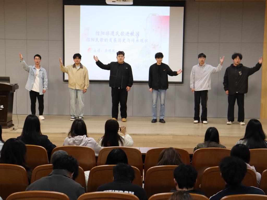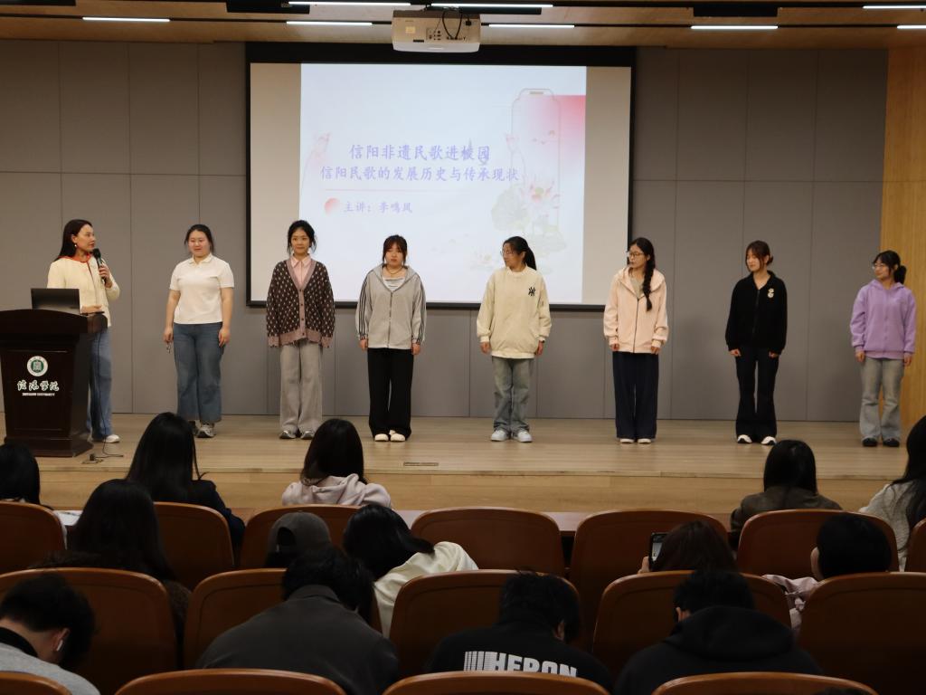 近年来,音乐学院高度重视艺术实践育人,鼓励教师把理论课程活态化、静态内容实践化,依托地方优秀传统文化推动艺术实践教学改革,着力提升学生的艺术实践能力与文化素养。此次邀请传承人走进理论课堂《信阳非物质文化遗产鉴赏》开展专题授课,是学院高度重视艺术实践教学、丰富实践教学形式、推动非遗文化与艺术教学深度融合的重要举措。本次授课不仅让学生们在实践中系统掌握了信阳民歌的文化底蕴,真切感受了本土非遗的独特魅力,同时也搭建起非遗文化与青年学生沟通的桥梁,为非遗文化的年轻化传承注入了新活力。下一步,学院将继续邀请更多非遗传承人走进校园,开展专题授课、实践体验等活动,让非遗之花在校园绽放,不断提升学生的艺术实践能力与文化素养。