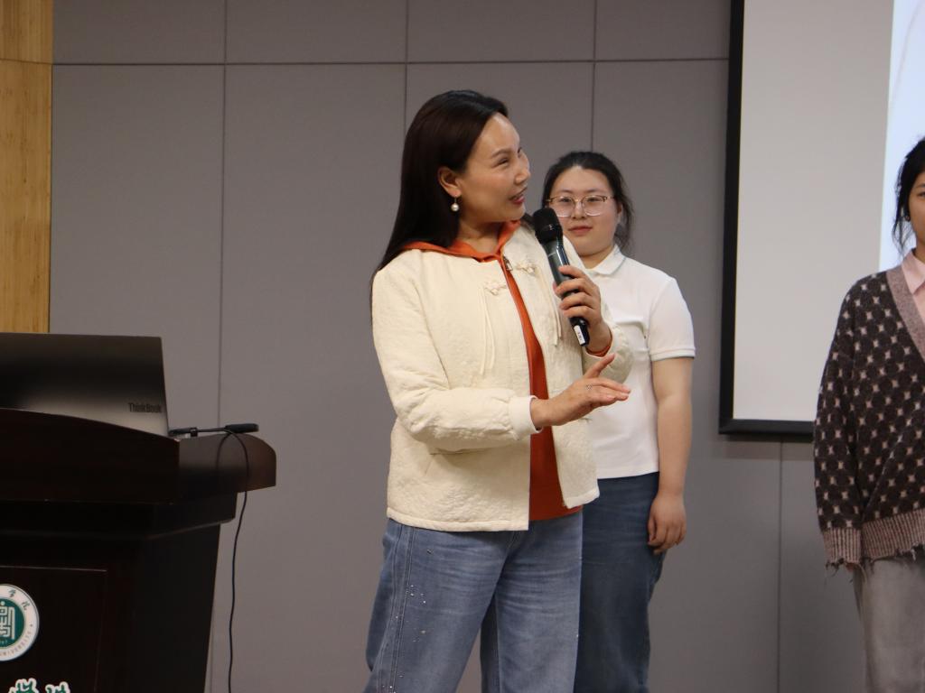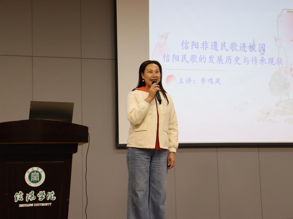 授课现场,李鸣凤结合自身数十年的传承经历,用生动通俗的语言,系统梳理了信阳民歌的历史脉络、文化内涵与艺术特色。她重点介绍了信阳民歌源远流长的历史:商城民歌作为河南省非物质文化遗产,地处吴头楚尾的独特地理位置,使其融合了吴歌楚辞的温婉韵味、皖腔苏调的清新余音与中州戏曲的厚重底蕴,形成了独具一格的艺术风貌。商城民歌涵盖号子、山歌、田歌、小调等多种类型,承载着商城人民的生活智慧与情感寄托,是世代传唱的精神文化载体。