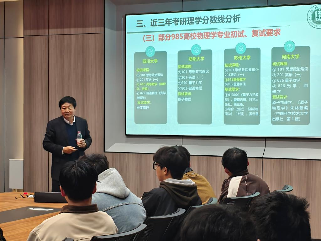 讲座中,李根全围绕考研政策解读、分数线趋势、择校策略、备考规划四大核心板块展开系统讲解。他深入剖析了2026年全国硕士研究生招生政策,详细解读初试、复试及调剂新规,明确学术学位与专业学位的培养差异;结合近五年考研数据与985高校理学分数线,他指出当前考研“整体降温、局部高烧”的形势特点,提醒同学们理性定位、重视单科线与院校院线;分享“三步定位法”与“冲、稳、保”择校体系,指导学生结合自身实力合理选择院校与专业;针对物理学专业初试科目,制定分阶段备考计划,突出公共课与专业课备考重点。李院长的讲座内容详实、针对性强,为同学们提供了清晰指引与实用参考。
