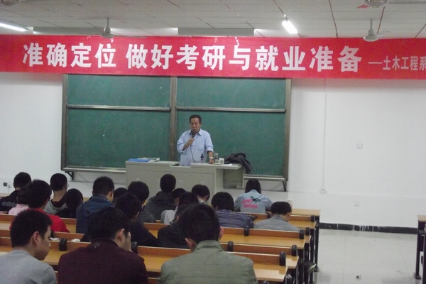 10月18日晚,土木工程系主任张伯平教授在教四楼112教室为300余名学生作了《准确定位 认真做好考研和就业准备》的辅导报告。
