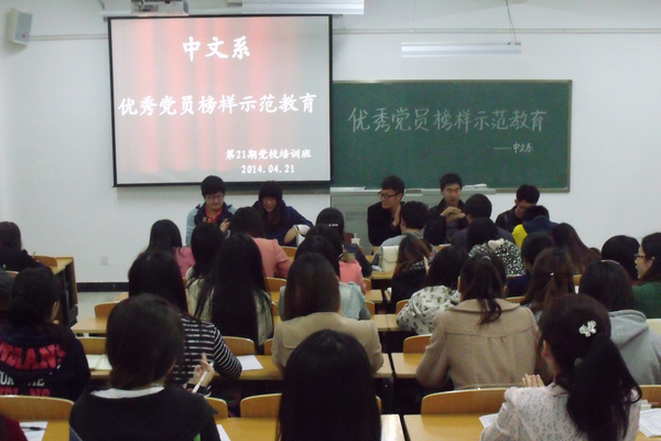 为了积极响应院党委的号召,4月21日晚,中文系于教五楼314教室举办“中文系优秀党员榜样示范教育”活动课。第21期入党积极分子培训班全体成员参加。