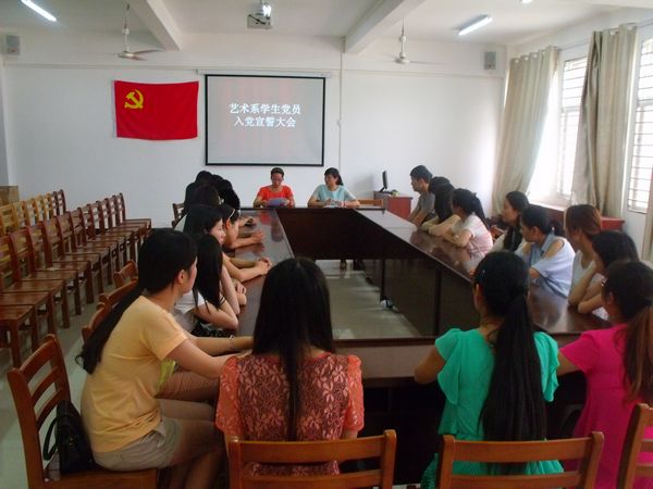 6月10日下午,艺术系党总支在艺术楼215会议室召开了接收预备党员暨预备党员转正宣誓大会。艺术系党总支副书记高昌慧、学生党支部书记李海丽和艺术系2014年上半年发展及转正的全体党员参加了此次会议。会议由学生支部书记李海丽主持。