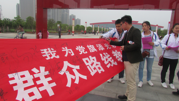 为了使党的群众路线教育实践活动更加深入人心,深入群众,使广大青年学子以青春力量助力美丽中国梦。日前,由我院经济管理系20多名青年志愿者组成的党的群众路线教育实践活动宣讲团,赴信阳市百花园广场、火车站等地开展“我为党旗添光彩,立足实际做贡献”活动,宣讲党的群众路线教育实践活动。