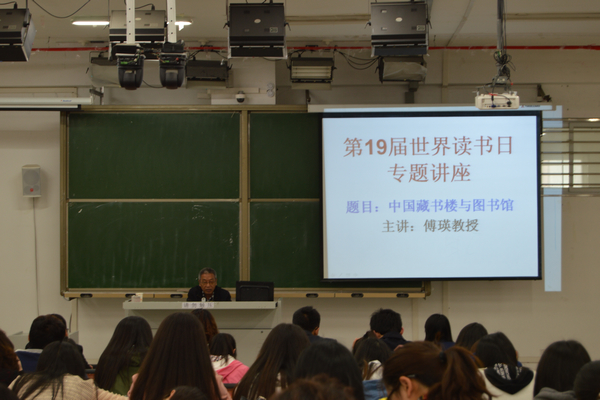 为迎接第19届世界读书日的到来,4月23日下午,图书馆馆长、中文系主任傅瑛教授在图书馆102教室作了题为《中国藏书楼与图书馆》的精彩讲座。师生200余人到场聆听。