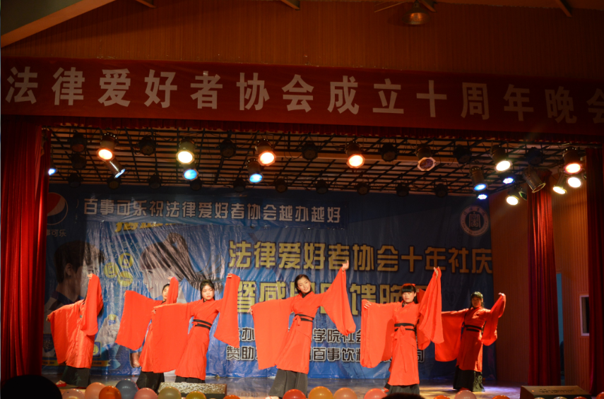 晚会现场,流光溢彩,热闹非凡。晚会伊始,由舞蹈协会带来的激情四射的开场舞《Big fat bass》调动全场气氛,点燃了观众的热情。视频《回顾》展现了法协自创办以来的各项普法和法制宣传活动,十年岁月,风雨兼程,硕果累累。唯美轻柔的歌曲《屋顶》、《方圆几里》让全场观众享受了一场耳朵的饕餮盛宴。幽默诙谐的小品《法律援助》以法律为背景向大家普及法律知识,更是博得了观众的阵阵掌声。双口相声《我有病》的包袱让会场笑声连连,武术协会带来的武术表演《武者风韵》由习武之人的一日三练为场景为大家带来令人惊叹的表演,铿锵有力的动作显示我国武术文化的博大精深。戏曲联唱的扎实唱功赢得大家一致好评,法协会员带来的诗歌朗诵《法在我心中》将整场晚会推向了高潮。古筝合奏《荷塘月色》给人以美的享受,一曲《青花瓷》温柔了所有人的心。魔术表演以情景剧的形式展开一个个魔幻手法引得整场晚会推向又一个高潮。汉服社带来的舞蹈《礼仪之邦》古香古色给人以穿越的错觉美不胜收。轮滑社的成员倾情演出,把大学生青春活力的特质演绎的淋淋尽致,连连不断的高难度动作赢得场下观众掌声不断。晚会节目类型多样,精彩纷呈,给同学们带来了一场难忘的视觉盛宴。晚会最后,信阳市中级人民法院邢三庭副庭长陈鑫带领全体师生进行宣誓。 晚会在激情昂扬的宣誓声中拉上了帷幕。