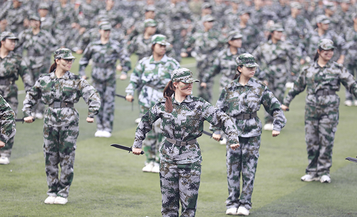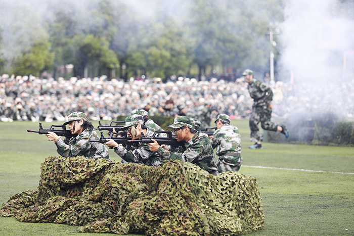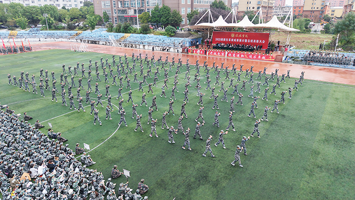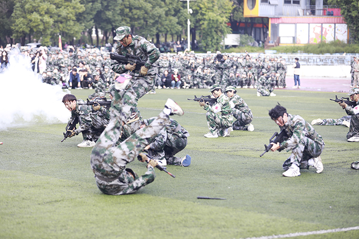 大会在庄严的国歌声中拉开帷幕。伴随着激昂的旋律,全体人员肃立,高唱国歌,爱国情怀与奋进力量在体育场内激荡。国歌毕,新生军训成果展示正式开启。2025级新生身着整齐戎装,以挺拔姿态组成各方阵,伴着嘹亮激昂的口号,迈着铿锵有力的步伐依次入场,充分展现出三周军训打磨出的良好风貌。军事科目汇报表演中,匕首操方阵动作刚劲利落、连贯有力,尽显青春锐气;战术演练环节,新生们模拟实战场景,动作规范娴熟、配合默契,将军训期间习得的军事技能展现得淋漓尽致,赢得现场阵阵掌声。