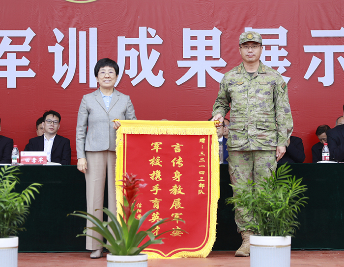 在热烈的掌声中,理事长高云代表学校向承训部队赠送锦旗,以此感谢部队对学校新生军训工作的大力支持与辛勤付出。校长为军政训练优秀组织单位颁奖;承训部队首长为红歌比赛获奖单位颁奖;全体与会领导共同为内务优秀宿舍代表、军政训练标兵代表、军政训练先进工作者、军政训练优秀教官代表颁奖。
