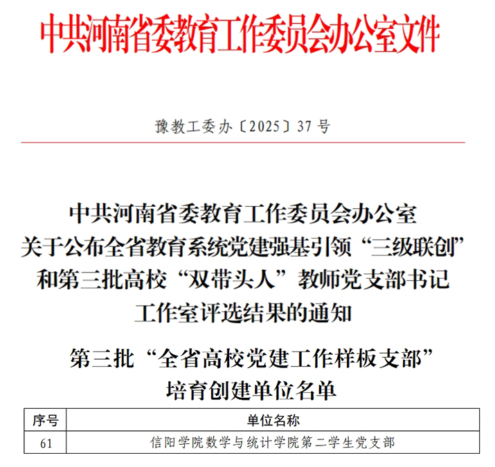 近日,省委教育工委印发了《关于公布全省教育系统党建强基引领“三级联创”和第三批高校“双带头人”教师党支部书记工作室评选结果的通知》(豫教工委办〔2025〕37 号),我校数学与统计学院第二学生党支部获评为第三批“全省高校党建工作样板支部”培育创建单位。
