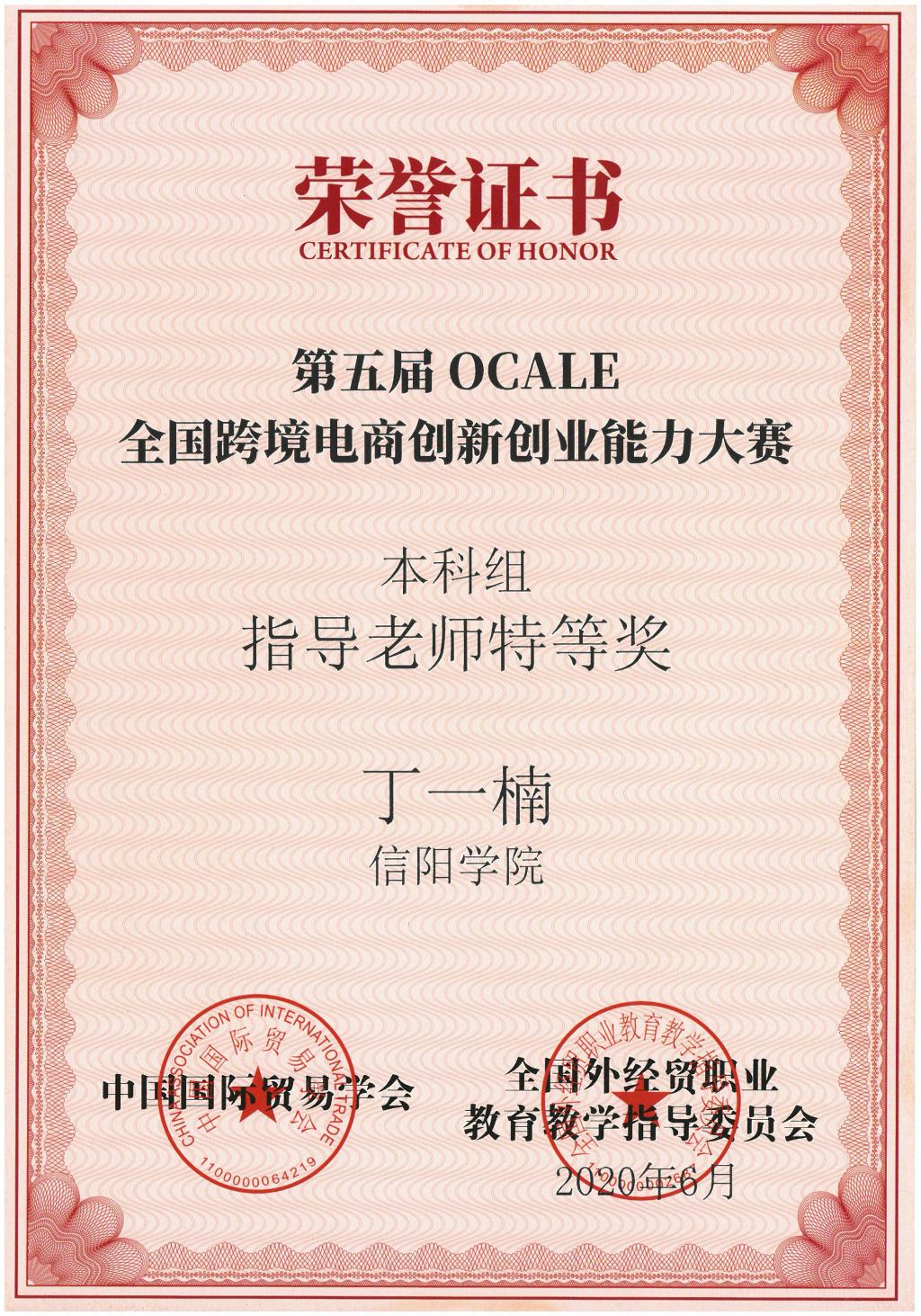 近日,由中国国际贸易学会和全国外经贸职业教育教学指导委员会共同主办的第五届OCALE全国跨境电商创新创业能力大赛落下帷幕。本届大赛共有来自全国23个省份203所高校的638支团队、1914名选手参赛。由王梦娇、李珂、张文莉三位同学组成的信阳学院商学院参赛队,在丁一楠、王喜凤老师精心指导下,齐心协力,经过三天12个回合、36小时的激烈角逐,喜获本科赛站全国团体特等奖。