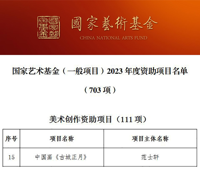 日前,国家艺术基金管理中心公布了《国家艺术基金(一般项目)2023年度资助项目名单》,我校美术与设计学院教师范士轩申报的中国画作品《古城正月》获批国家艺术基金2023年度资助项目。这是我校继袁汝波教授获批国家艺术基金2022年度资助项目之后,再次获得国家艺术基金项目,是学校艺术类专业在推进一流专业建设中获得的重要标志性成果。