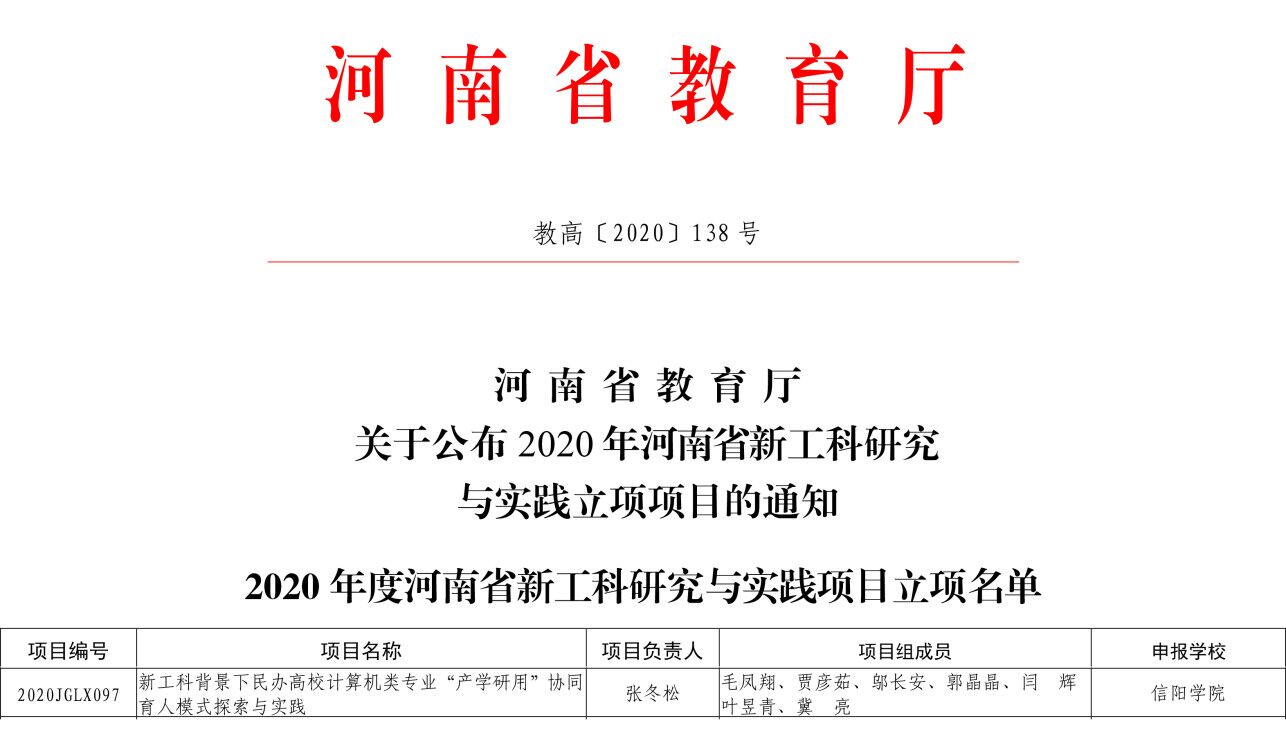 近日,河南省教育厅发出《关于公布2020年河南省新工科研究与实践立项项目的通知》(教高〔2020〕138号)。我校大数据与人工智能学院张冬松博士主持的项目《新工科背景下民办高校计算机类专业“产学研用”协同育人模式探索与实践》获批立项,这是我校大数据与人工智能学院成立以来获得的一项重要研究课题。