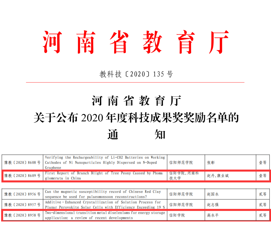 近日,河南省教育厅发出《关于公布2020年度科技成果奖奖励名单的通知》(教科技[2020]135号)。其中,我校理工学院教师赵丹以第一作者发表的学术论文“First Report of Branch Blight of Tree Peony Caused by Phoma glomerata in China”获得一等奖,科研处高永平以第一作者发表的学术论文“Two-dimensional transition metal diseleniums for energystorage application: a review of recent developments”获得二等奖,实现了我校该类成果奖的突破。