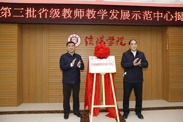 在与会人员热烈的掌声中,刁玉华分别与高云共同为我校河南省高性能绿色化工与能源关键材料工程研究中心揭牌,与王北生共同为我校河南省第三批省级教师教学发展示范中心揭牌,并与两个中心的负责人员分别合影留念。