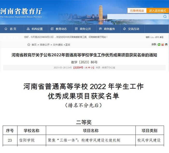 近日,河南省教育厅下发了《河南省教育厅关于公布2022年普通高等学校学生工作优秀成果项目获奖名单的通知》(教学〔2023〕86号),经高校推荐,省教育厅组织专家通过网络评审、专家评议、现场展示、专家终审和网上公示,我校《聚焦“三维一体”:构建学风建设长效机制》项目荣获二等奖。