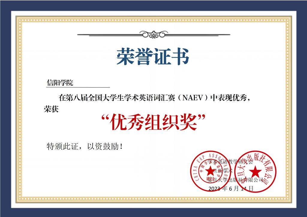 近日,由中国学术英语教学研究会主办,由复旦新学术及复旦大学出版社有限公司等联合承办的第八届全国大学生学术英语词汇竞赛公布了比赛结果。经过初赛、复赛的激烈角逐,我校荣获“优秀组织奖”。